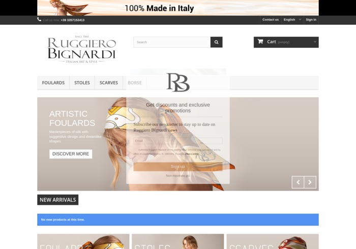 The Full-art brand by Ruggiero Bignardi has in its core-business the idea, the artistic know-how, the elaboration and the graphic creation of women-man scarves. Particular attention has been paid to the choice of raw materials , precious silk fibers from the comasco districts, but also twill cotton, wool and cashmere. The finishing touches were exclusively handmade to give the product that element of intrinsic quality and its identification with Made in Italy . The true essence lies in the choice of design and color nuances, all of our collections represent the connection between art and fashion, between art and fashion design, between culture and expression, to allow all lovers of realization artwork to wear unique pieces that are unrepeatable from the unmistakable value.The main products of our collections are: - Mis 90x90 (94x94 pre ornament) scarf 14mm silk twill handmade finishes. - Mis 70x70 silk twill handmade finish 14 - Mis. 140x140 handmade finish Silk Mouselline. - Maxi Twilly - losanga - mis 20x220 double face, tubular, cut silk twill bias 12 mm. - Scarf man / woman mis 70x180 + hem with fringe 80% cotton and 20% silk .... other (twill cotton, silk and wool, silk and cashmere, wool) All scarves of any size can also be made in Twill Cotton; mixed silk (80% cotton, 20% silk) or light silk (12 mm). Men / women - scarves we usually make them in cotton and silk / twill cotton, wool or silk and wool or silk and cashmere. The wide choice of color variants makes the whole collection available for every season of the year. Our brand offers exclusive leather handbags too, each of them enriched by a matching silk scarf.Our bi-color luxury bags are handmade by skilled artisans, in low quantities.